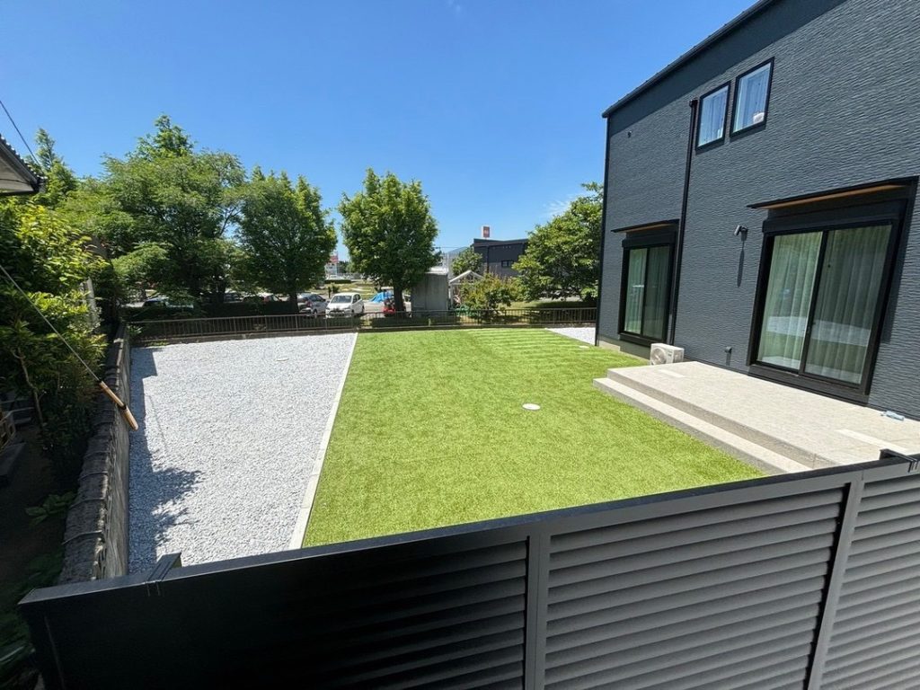 お庭全体に高品質な人工芝を敷設し、一年中緑豊かなプライベート空間を実現。